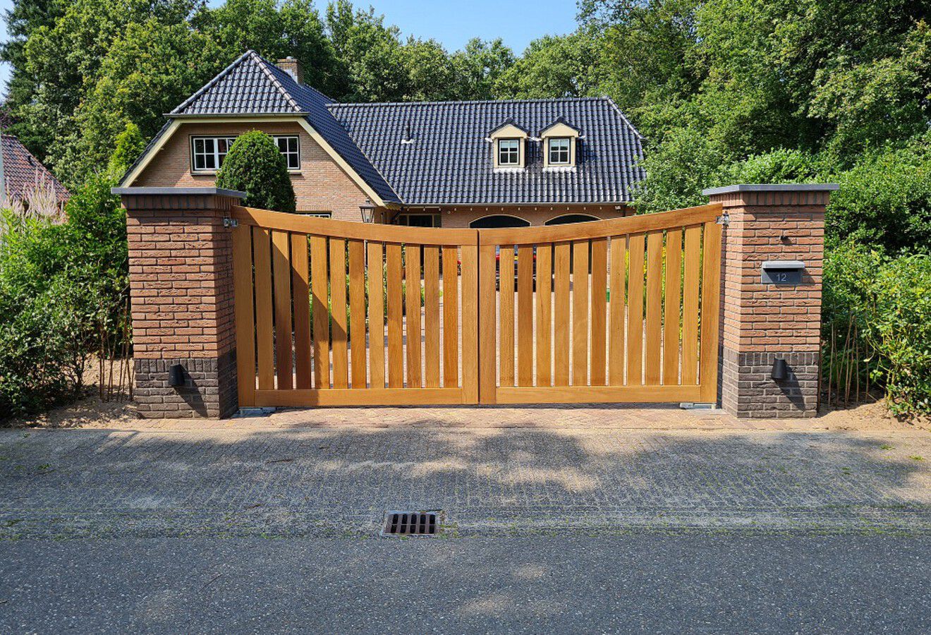 Deze tuin is prachtig afgewerkt met een houten toegangspoort. De toegangspoort is voorzien van een automaat, zodat u vanuit uw auto de toegangspoort kunt bedienen.