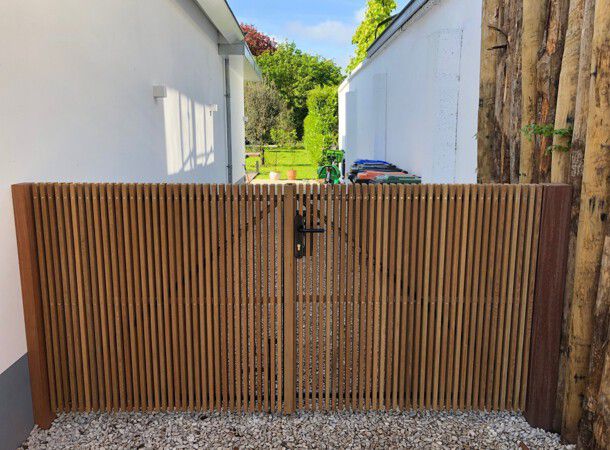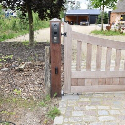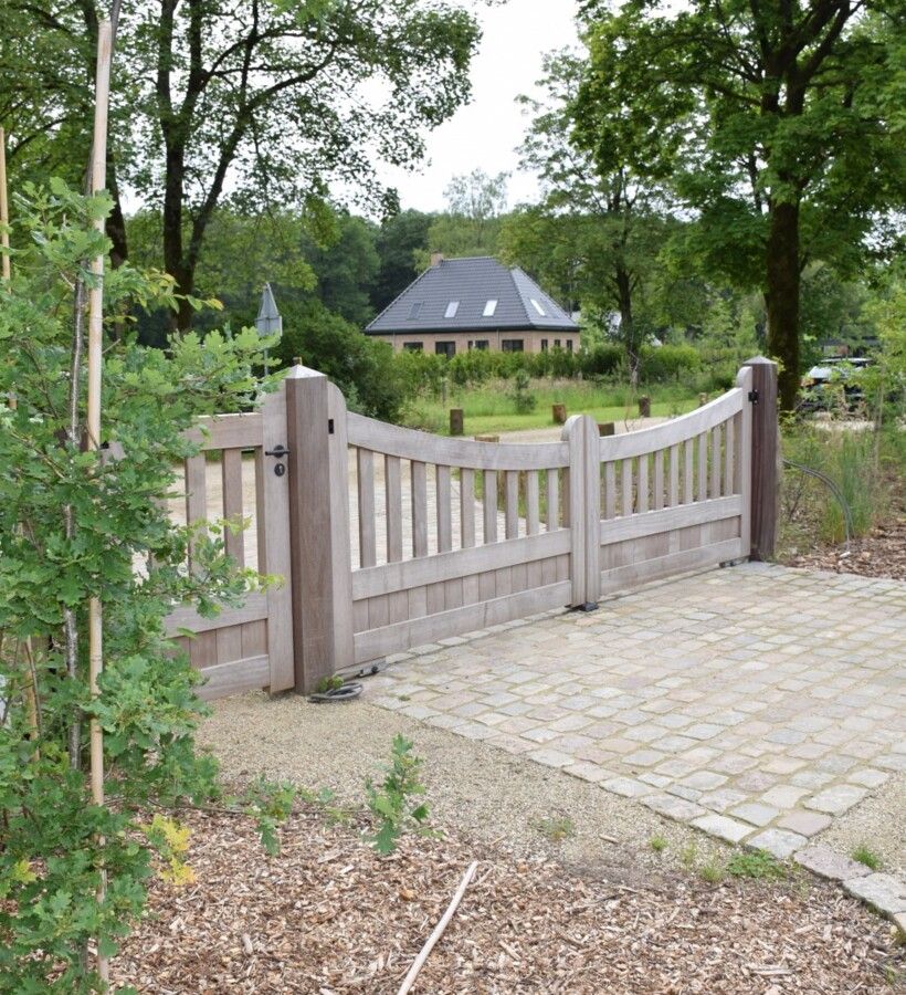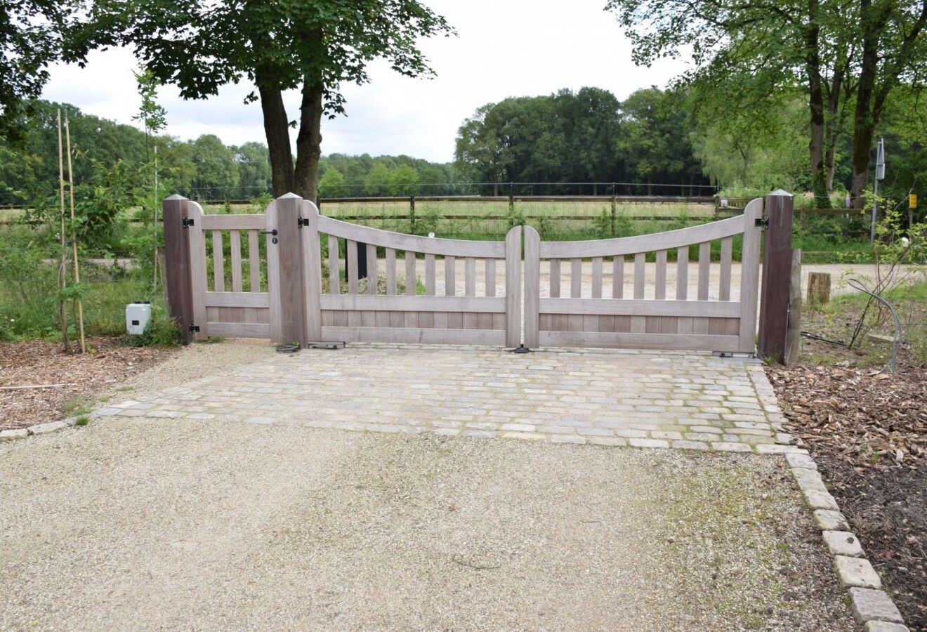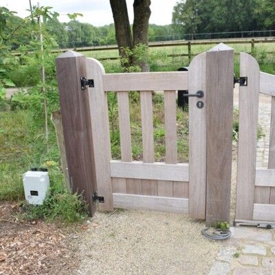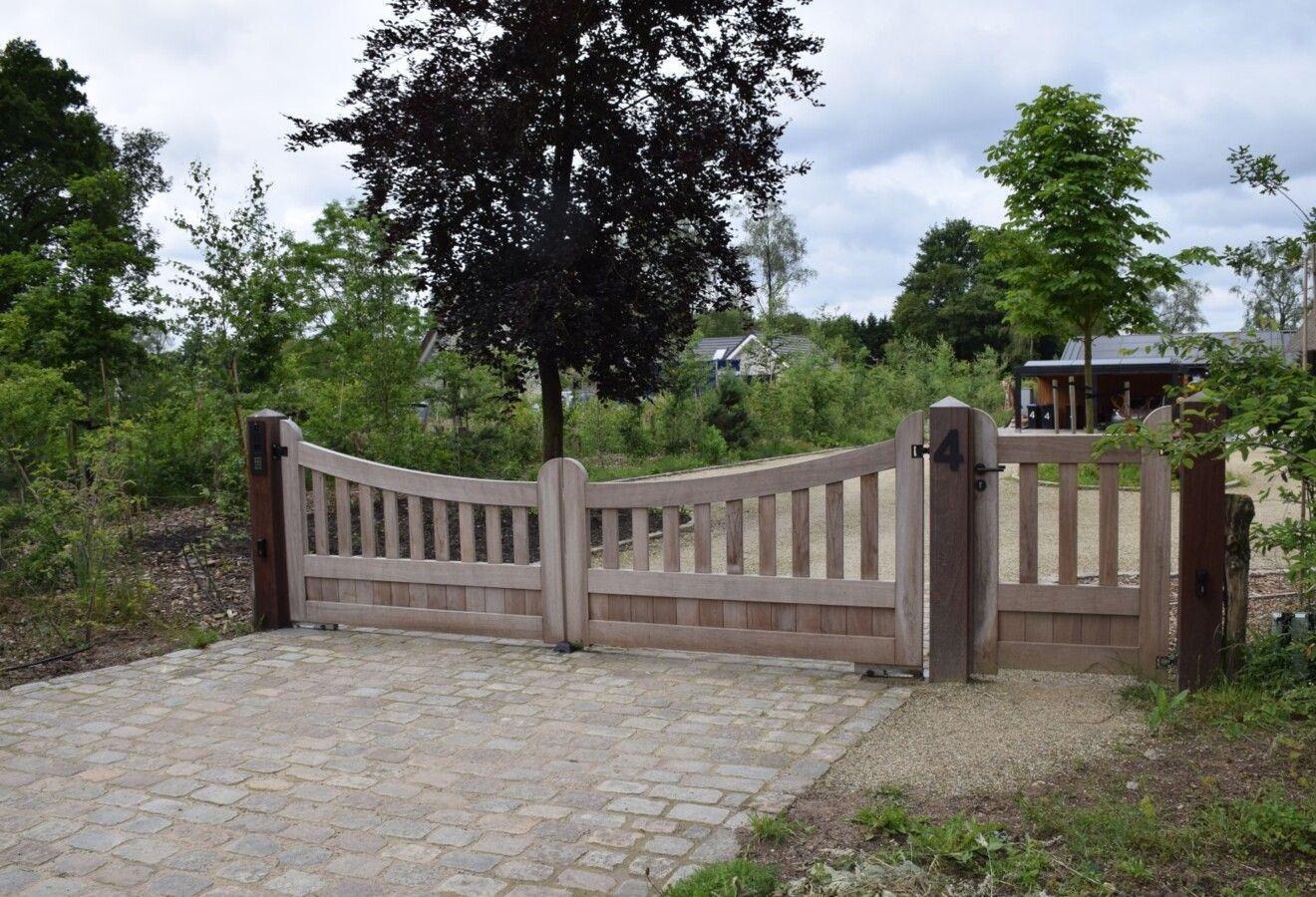 Deze hardhouten toegangspoort is gemaakt van geschaafd Iroko hout. De toegangspoort hangt tussen hardhouten palen. De poort is voorzien van grondmotoren, waardoor deze van afstand is te bedienen. Een prachtige toegangspoort aan het begin van uw inrit!